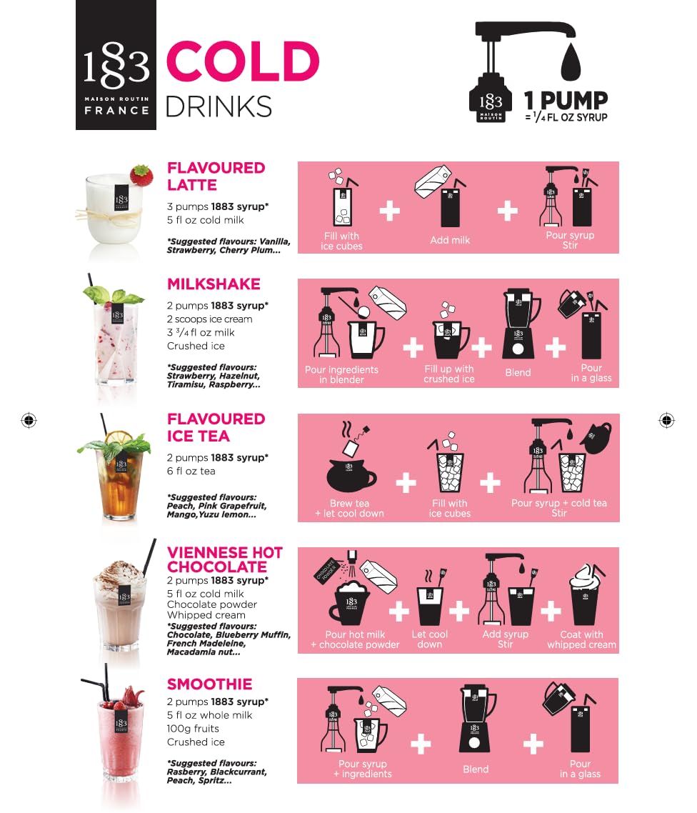 Çilekli Iced Latte 1 espresso shot, 200 ml soğuk süt, 20 ml 1883 Çilek Şurubu, buz. Bardağa buzu ve şurubu ekleyin. Üzerine sütü ilave edip karıştırdıktan sonra taze espressoyu dökün. Çileğin meyvemsi tatlılığı ile espresso gövdesinin dengeli birleşimi için öneriyoruz.